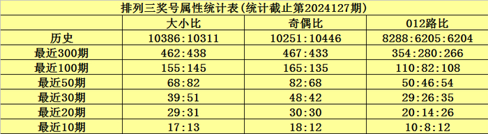 上期回顾:排列三第2024127期奖号为744,奖号012路比为0:3:0,奇偶比为1:2,大小比为1:2,和值为15,跨度为3。