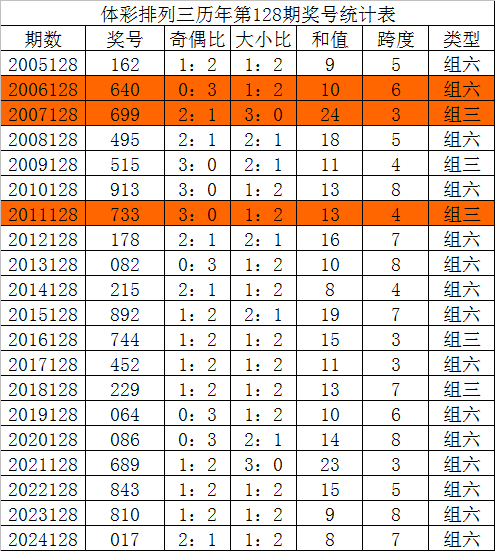在历年排列三第129期开奖中:组三号码出现9次,组六号码出现10次。组六号码开出比例略低,本期奖号形态看好:组六号码。