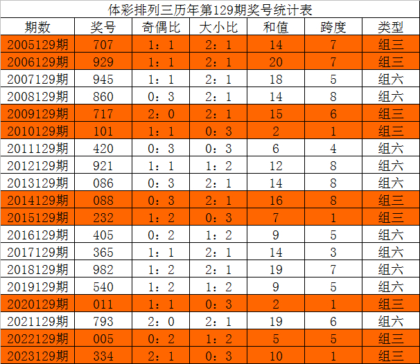 体彩排列三历年第129期开出奖号分别为:707、929、945、860、717、101、420、921、086、088、232、405、365、982、540、011、793、005、334。统计详见下表: