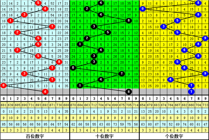 3、在以上0-9号码频次中,号码大小比为28:33,012路比为22:20:19,本期预计百位开出0路号码,参考号码6。