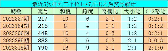 1、排列三前两期个位分别开出号码4和7,历史上个位号码连续两期分别出现4和7时,共有76次。在最近5次出现时,其下期分别出现号码:217、215、448、882、790;