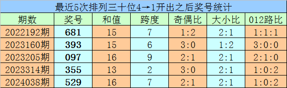 1、最近两期排列三十位号码开出号码分别为4和1,历史上十位号码连续两期同时出现号码4和1的奖号共开出62期。最近五次下期开出号码为:681、393、097、355、529;