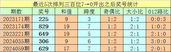 1、排列三最近两期百位号码分别开出7和0,历史上百位号码连续两期分别开出7和0的奖号出现了62期。前五期开出之后其下期奖号分别为:225、829、649、306、629;
