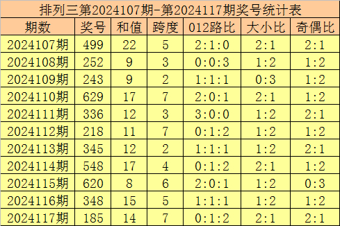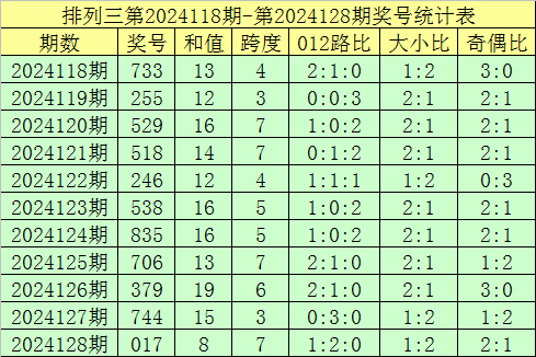 开奖回顾:排列三第2024128期奖号开出:017,组选类型:组六,大小比为1:2,奇偶比为2:1,和值为8,跨度为7。