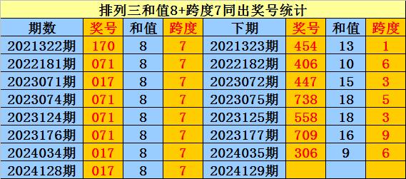 排列三近8次和值8+跨度7同出时奖号为:170、071、017、071、071、071、017、017,下期分别出现:454、406、447、738、558、709、306。