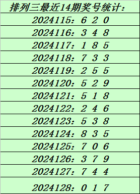 上期回顾:排列三第2024128期奖号:017。和值8,跨度7。