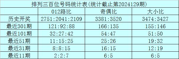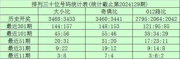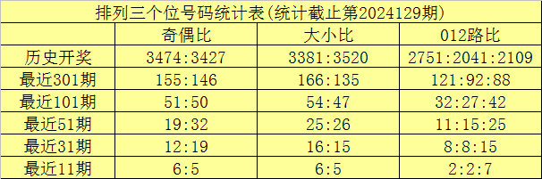 上期回顾:排列三第2024129期奖号为:278。奖号形态组六,大小比2:1,奇偶比1:2,012路0:1:2。