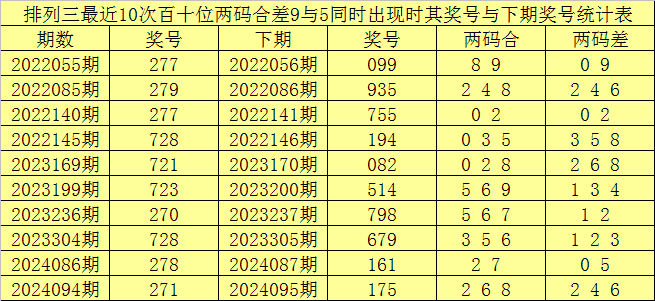 百十位合差分析:上期奖号百十位开出27组合,两码合为9,两码差为5,最近10次百十位两码合9与两码差5同时出现时,其奖号和下期奖号分别为: