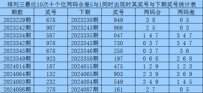 十个位合差分析:上期奖号十个位开出78组合,两码合为5,两码差为1,最近10次十个位两码合5与两码差1同时出现时,其奖号和下期奖号分别为: