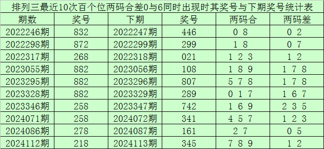 从以上统计可以看出,百个位两码合差0与6同时出现之后其下期两码合差表现最热的4个分别为:1278,本期百个位两码合差可以参考这四码中的数据。