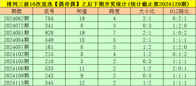 开奖回顾:排列三第2024129期开出奖号:278,类型为组六,和值为17,奇偶比为1:2,大小比为2:1,跨度为6。