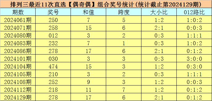排列三上期奖号为278,开出奇偶类型为【偶奇偶】,前10次【偶奇偶】类型奖号分别开出:250、258、012、232、278、030、474、210、252、218;