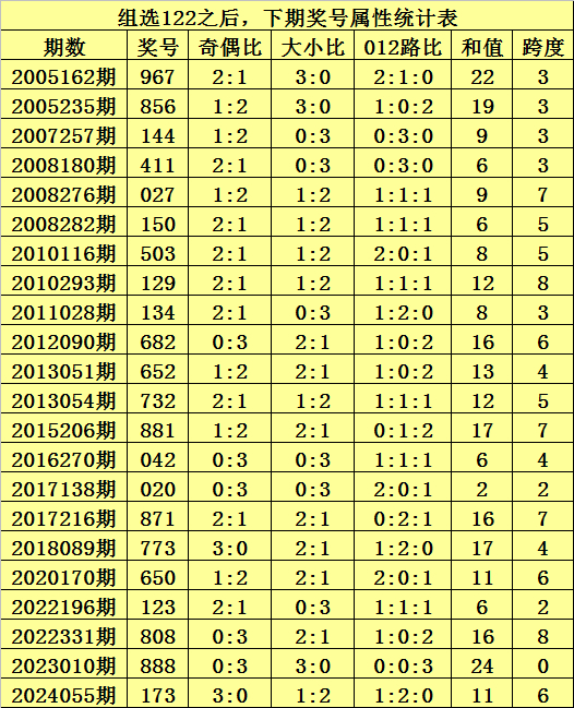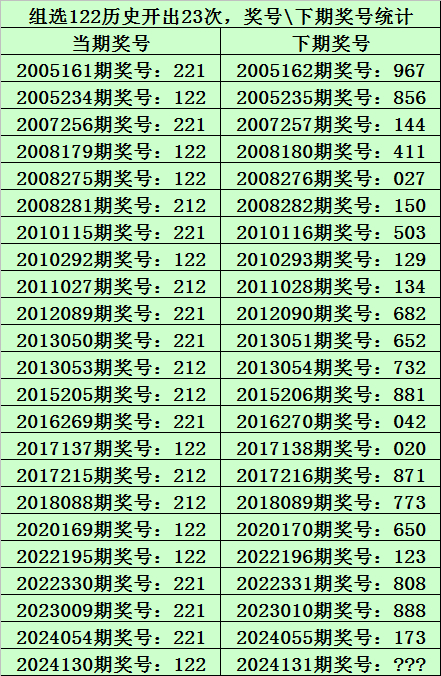 二、组选122分析:排列三历史上已开出23次组选号码122了,其奖号和下期开出奖号统计如下: