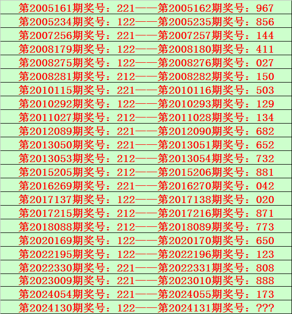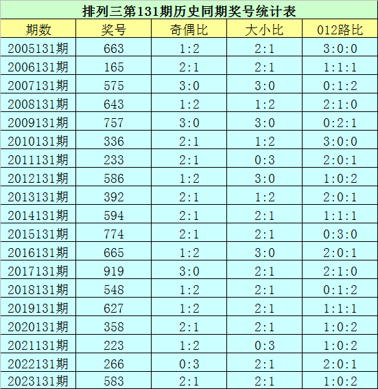 排列三第2024131期开奖日期:2024年5月20日,历史上第131期已开出了19次奖号,历年同期号码分别为:663、165、575、643、757、336、233、586、392、594、774、665、919、548、627、358、223、266、583。