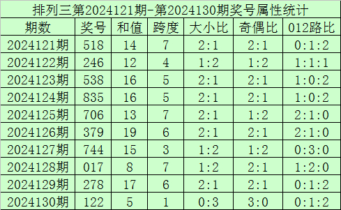 上期回顾:排列三第2024130期开奖号:122,奖号和值:5,奇偶比3:0,大小比0:3。