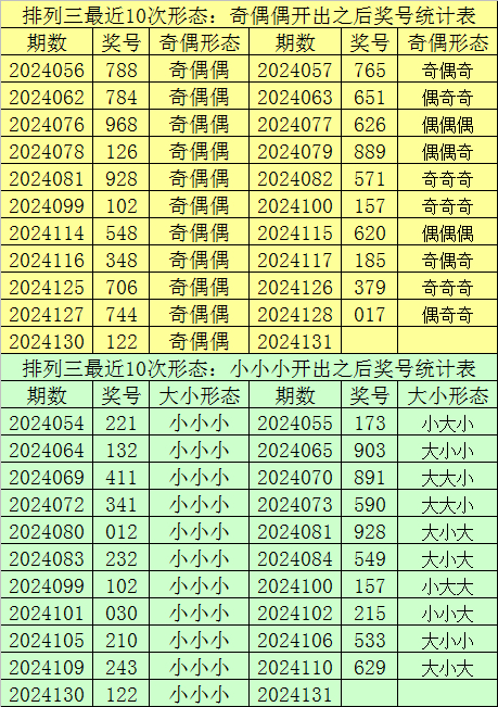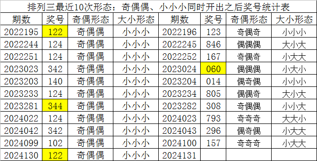 排列三最近10次同时开出奇偶形态:奇偶偶和大小形态:小小小时其奖号分别为:122-124-124-342-140-124-344-124-342-102-122,下期分别开出号码为:123-846-167-060-014-805-308-793-296-157,详细统计见下表: