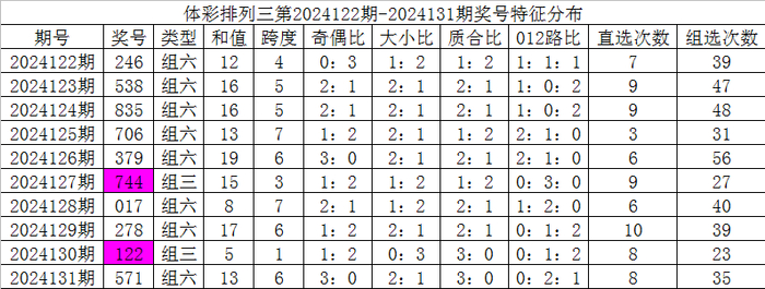 开奖公告:体彩排列三第2024131期开出奖号:571。组六,有重号:1,奇偶比3:0,大小比2:1,012比0:2:1,和值13,跨度6。
