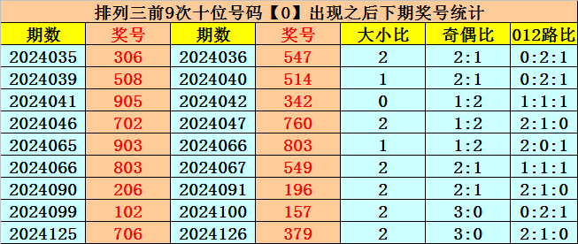 十位号码:十位上期开出偶数、小号、0路号码:0,历史上十位号码0共开出671期,上一次出现在第2024125期,上期奖号遗漏值为6期。