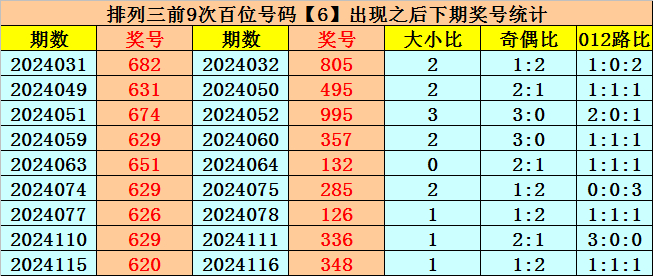 在百位前9次出现号码6之后,下期百位分别开出奖号:8-4-9-3-1-2-1-3-3,其中开出号码个数大小比是2:7,012路比是4:3:2,奇偶比是6:3。