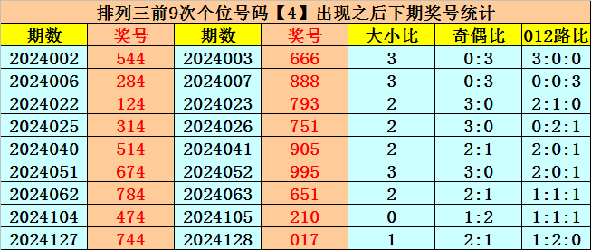 个位号码:上期奖号为小号、偶数、1路号码:4,历史上个位号码4共开出765期,前一次出现在第2024127期,上期遗漏4期再出。