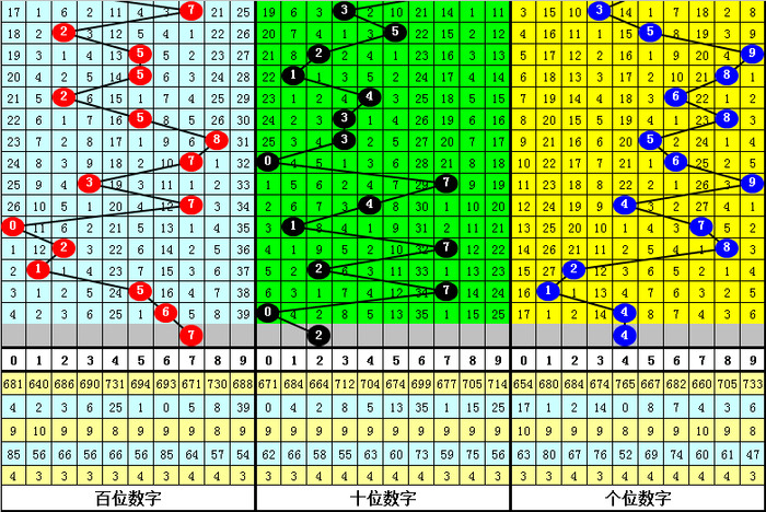 在十位前9次出现号码0后,其下期奖号分别开出:4-1-4-6-0-4-9-5-7,其中奖号个数奇偶比是4:5,大小比是4:5,012路比是3:5:1。