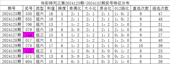 开奖公告:体彩排列三第2024132期开出奖号:604。组六,无重号,奇偶比0:3,大小比1:2,012比2:1:0,和值10,跨度6。