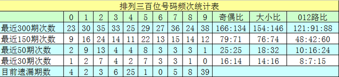 百位号码:前50期走势活跃的号码为:2开出13个,1开出9个,5开出8个;走势最冷的号码为:9开出1个,0开出2个,6、7、8开出3个。奖号012路比开出10:16:24,奇偶比开出25:25。本期百位杀排除:0、4,注意号码1、7、9,胆码参考1。