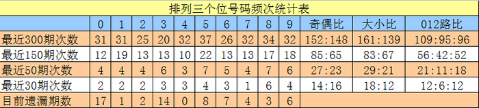 个位号码:前50期走势最活跃的号码为:5、8开出7个,3、9开出6个;走势最冷的号码为:4开出3个,0、1、2、7开出4个。个位号码大小比开出29:21,奇偶比开出27:23。本期个位排除两码:0、9,关注号码3、6、7,胆码参考7。