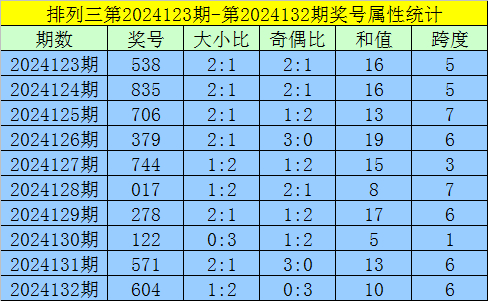 上期回顾:排列三第2024132期出现奖号604。开出组六,奇偶比0:3,012路比2:1:0,大小比1:2,和值10,跨度6。