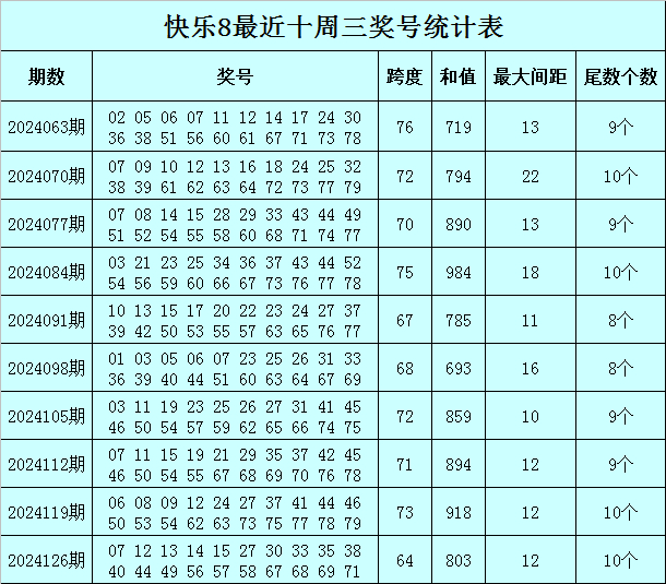 福彩快乐8第2024126期(上周三)回顾:07 12 13 14 15 27 30 33 35 38 40 44 49 56 57 58 67 68 69 71,其中奖号首尾间距为64,和值为803,最大间距为12,尾数分布为:尾数1、2、6包含1个号码,尾数0、3、4、5、9包含2个号码,尾数8包含3个号码,尾数7包含4个号码。