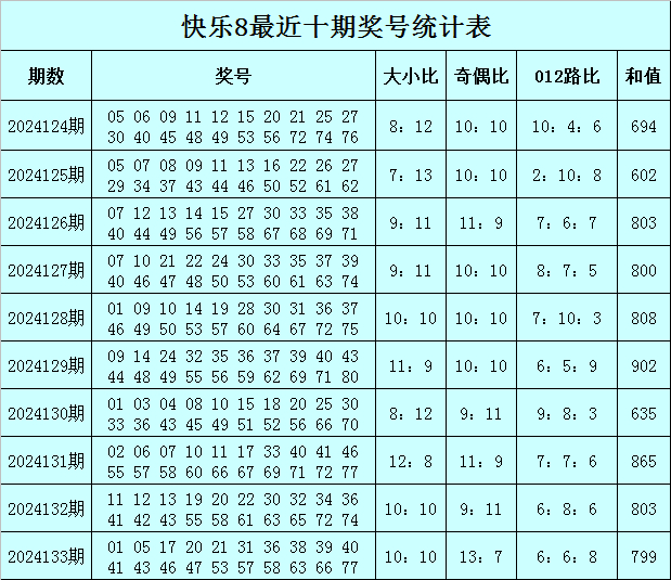 福彩快乐8第2024133期开奖回顾:01 05 17 20 21 31 36 38 39 40 41 43 46 47 53 57 58 63 66 77,其中奖号奇偶比开出13:7,大小比开出10:10,012路比开出6:6:8,和值为799,跨度为76。