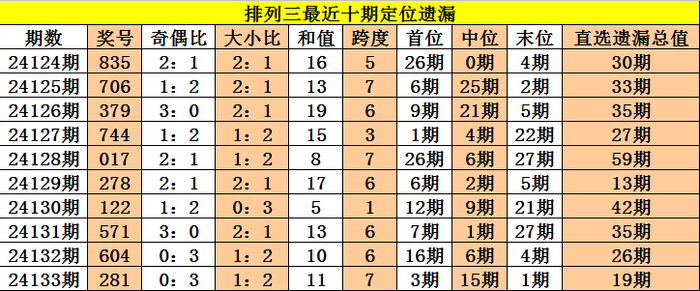 开奖回顾:排列三第2024133期奖号:281,定位直选遗漏值3期、15期、1期,遗漏总值为19期。