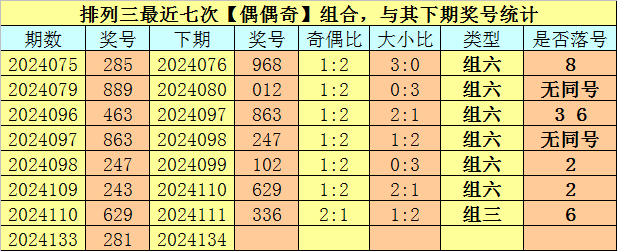 开奖回顾:排列三第2024133期开奖号码为:281。奖号类型为:组六,大小类型为:小大小,奇偶类型为:偶偶奇,无重号。