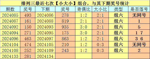 大小分析:排列三上期开出号码281,大小类型为【小大小】,最近七次开出大小类型小大小的奖号分别为:493、161、150、271、463、474、252,其下期分别开出号码:278、819、935、175、863、210、243。其中号码大小比为10:11,大小号码出现次数基本相当,本期注意大号转热,看好出现2个大号。