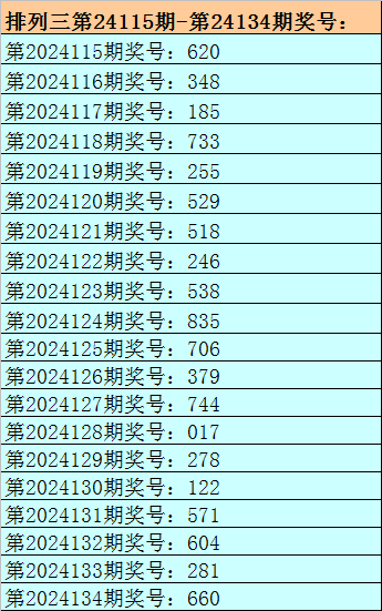 开奖回顾:排列三第2024134期开出奖号:660。其中奖号大小比为2:1,奇偶比为0:3,012路比为3:0:0,和值为12,跨度为6。