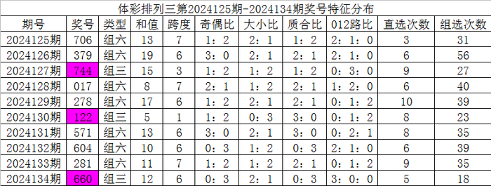 开奖公告:体彩排列三第2024134期开出奖号:660。组三,无重号,奇偶比0:3,大小比2:1,012比3:0:0,和值12,跨度6。