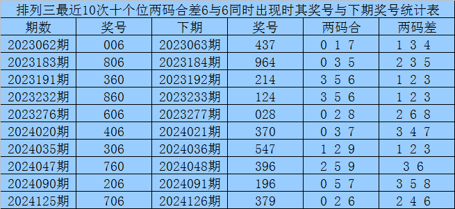 从以上统计可以看出,十个位两码合差6与6同时出现之后其下期两码合差表现最热的4个分别为:0235,本期十个位两码合差可以参考这四码中的数据。