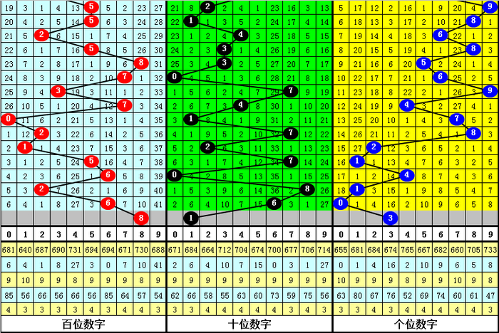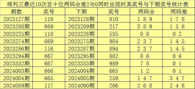 从以上统计可以看出,百十位两码合差2与0同时出现之后其下期两码合差表现最热的4个分别为:0127,本期百十位两码合差可以参考这四码中的数据。