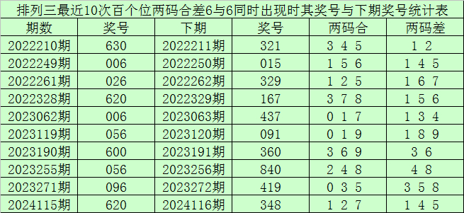 百个位合差分析:上期奖号百个位开出60组合,两码合为6,两码差为6,最近10次百个位两码合6与两码差6同时出现时,其奖号和下期奖号分别为: