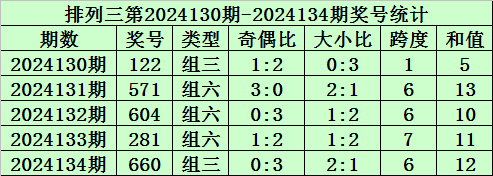 上期回顾:排列三第2024134期开奖号码为660。奖号类型为组三,奇偶比为0:3,大小比为2:1,跨度为6,和值为12。