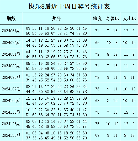 福彩快乐8第2024130期开奖回顾:01 03 04 08 10 15 18 20 25 30 33 36 43 45 49 51 52 56 66 70,其中奖号奇偶比为9:11,大小比为8:12,012路比为9:8:3,首尾间距为69。