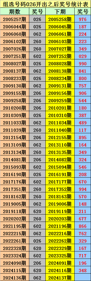 排列三组选026出现之后下期分别开出:976、187、224、223、349、029、990、841、800、757、906、544、180、387、489、117、895、164、349、324、546、208、670、994、570、148、211、677、866、762、329、167、717、196、348。