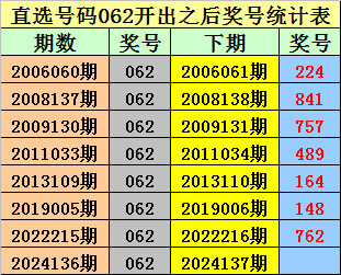 排列三直选062出现之后下期奖号分别为:224-841-757-489-164-148-762。