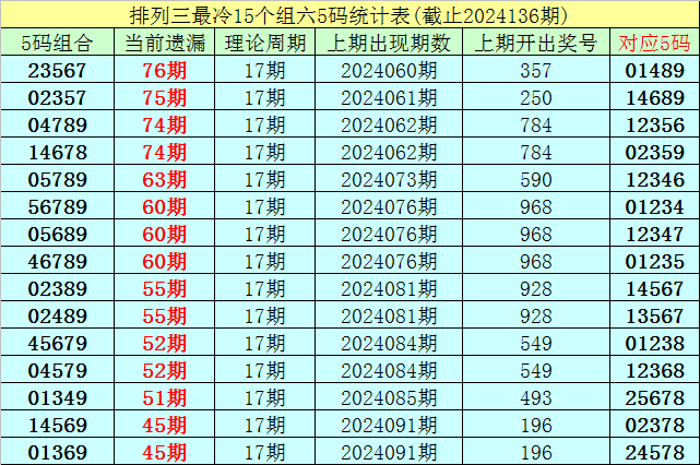 (4)排列三第2024136期遗漏值最大的十个5码组六组合解冻了0个;