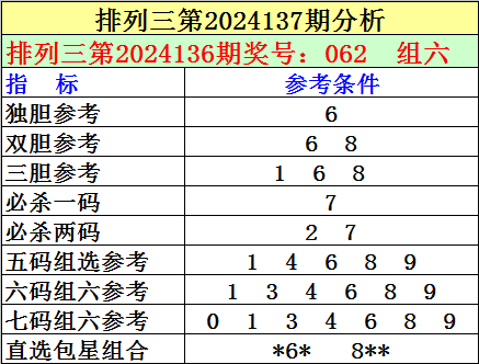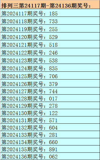 开奖回顾:排列三第2024136期开出奖号:062。其中奖号大小比为1:2,奇偶比为0:3,012路比为2:0:1,和值为8,跨度为6。