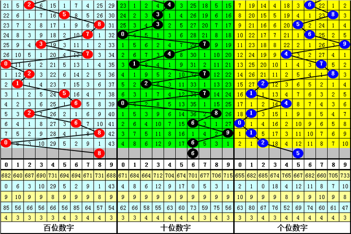 第二位杀号:第二位上期开出奖号为6,该位历史上奖号6开出了701次,最近100次第二位奖号出现6后,下期落号0-9次数从高到低分别为:号码8→16次,6→13次,1、2→12次,3、4→11次,5、7→7次,0→6次,9→5次。