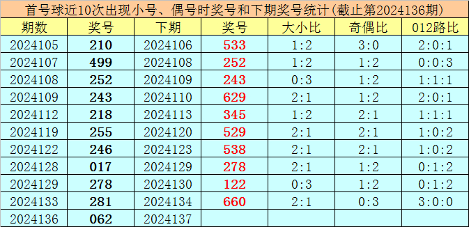在首号球前10次开出小号、偶号类型之后,其下期分别开出奖号:533、252、243、629、345、529、538、278、122、660,其中号码奇偶比为5:5,大小比为5:5,012路比为3:1:6。