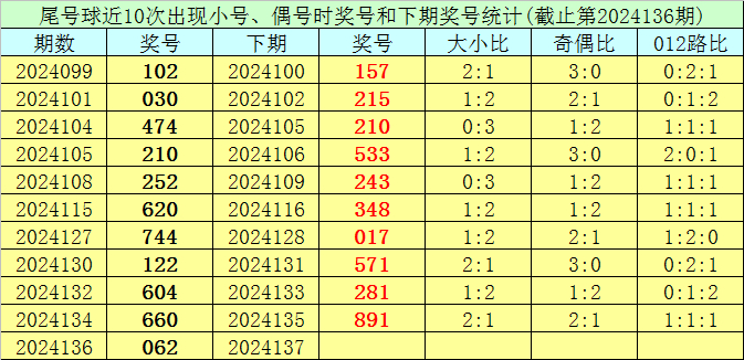 在尾号球前10次开出小号、偶号类型之后,其下期分别开出奖号:157、215、210、533、243、348、017、571、281、891,其中号码大小比为4:6,012路比为3:5:2,奇偶比为8:2。