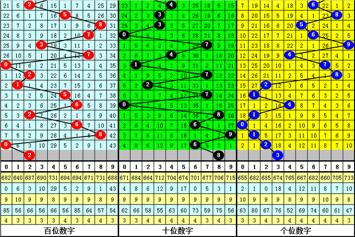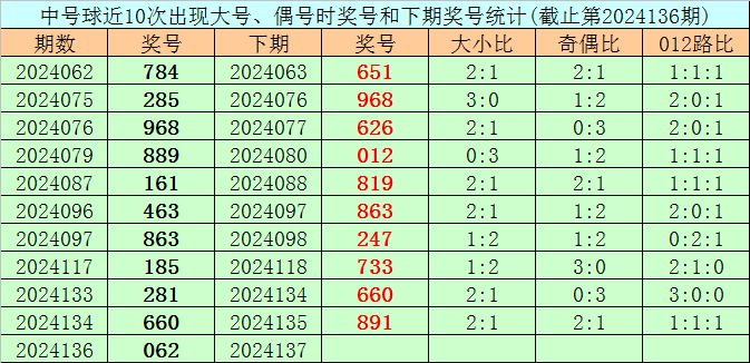 中号球:上期奖号为6,开出大号、偶号,该位前10次开出大号、偶号的现象时其奖号分别为:784、285、968、889、161、463、863、185、281、660,其中中号球012路比为5:0:5。