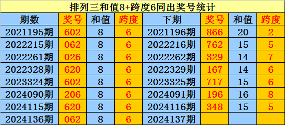 排列三近8次和值8+跨度6同出时奖号为:602、062、026、620、602、206、620、062,下期分别出现:866、762、329、167、717、196、348。
